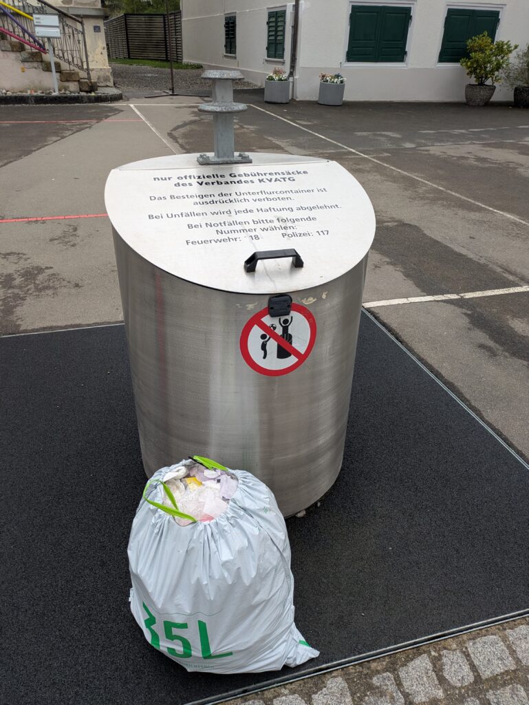 Auf dem Weg zu meinen Terminen bringe ich noch den Müll weg. Wie gesagt, der Mann ist nicht da…In der Schweiz gibt es Unterflorcontainer. Keine Mülltonnen stehen rum, der Müll wird unterirdisch gelagert und einmal die Woche abgeholt.